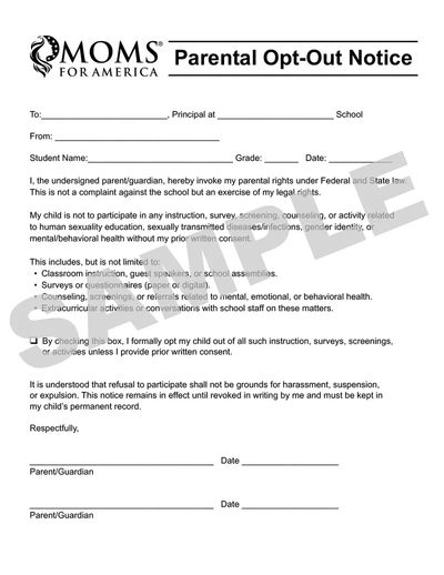 That’s why we’re sharing the Parental Opt-Out Form, created by Moms for America. This tool empowers you to clearly and legally set boundaries on what your child is exposed to in the classroom.